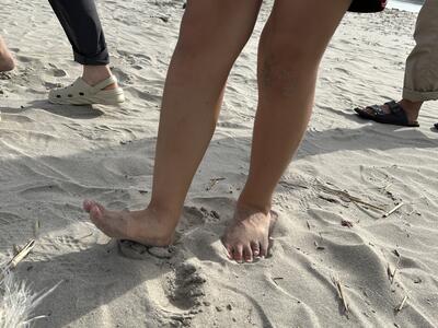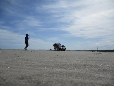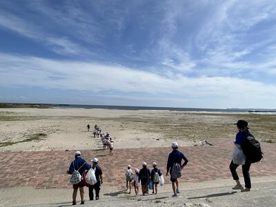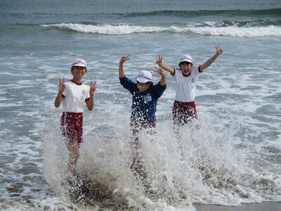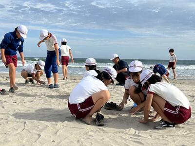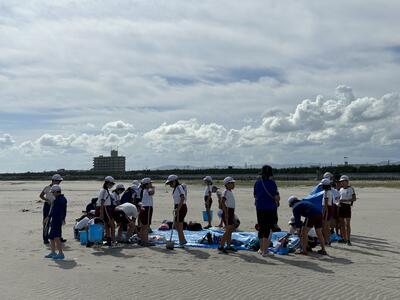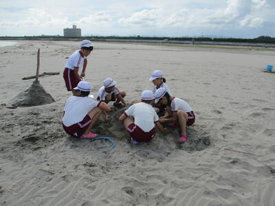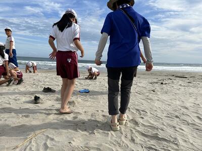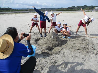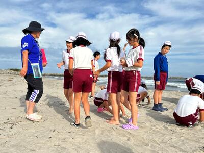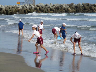 1日目の午後、砂の芸術で訪れた四倉海岸。広い砂浜を歩き回っていた子どもたち、「先生、キュッキュッって音がするんですけど」と教えてくれました。どれどれ!と確かめてみると、あるところだけキュッキュッって心地よい音がしました。ずばり「鳴き砂」です!