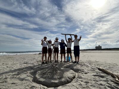 1日目の午後はバスで四倉海岸へ。Act.2「班対抗・砂の芸術大会!」にチャレンジ!共通テーマは「友情」。その時々で対話を積み重ね、砂をかき集めたり、海水を汲みに行ったり、漂着した棒や貝殻を拾ったりして。各班お互いに出来栄えをチラ見しながら完成させていきました。審査では各班に作品のポイントをプレゼンしてもらいましたが、結果は甲乙つけ難く、学校に戻ってから審議することとなりました。