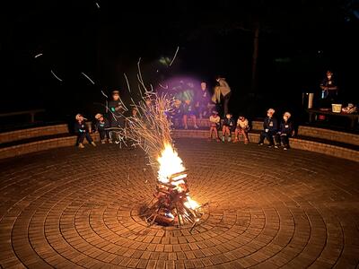 夜は野営場に移動して、お待ちかねのAct.3「キャンプファイア」でございます。4人の火の守を引き連れて火の神降臨!「そなたには『自分の考えを見つける力』を与えよう!」等と、どこかで聞いたことのあるキーワードが。与えられた火の守は「この宿泊活動で楽しかったことやこれからの生活で大切なことについて自分の考えを持てるように頑張ります!」と話しました。このやりとり、アドリブてございます。ちょっと意地悪な火の神が台本を変えて話したのですが、火の守たちは自分の言葉でしっかり答えてくれました、拍手!