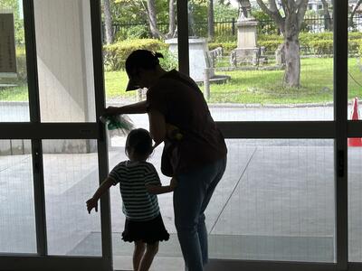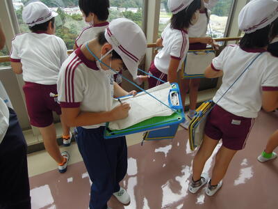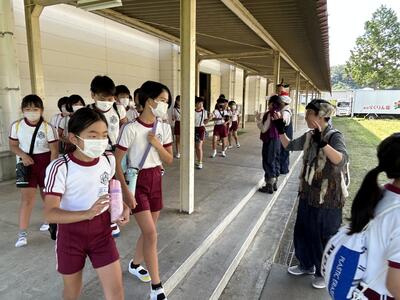 中学年の見学学習の出発もお留守番の教頭先生へ、元気に「行ってきまーす!」と。