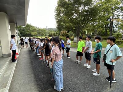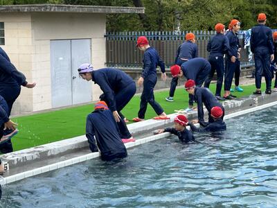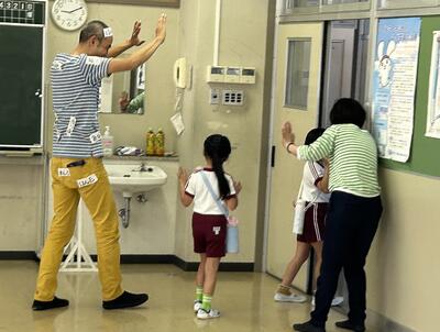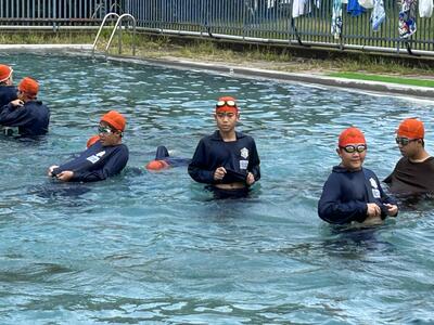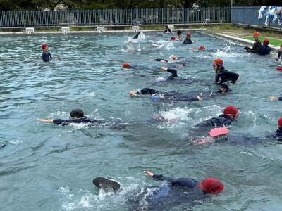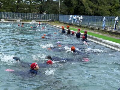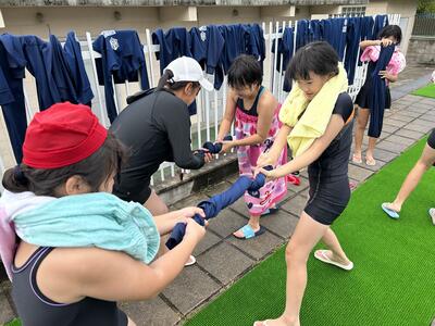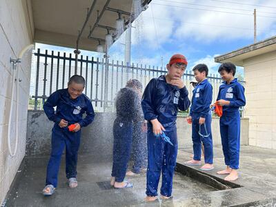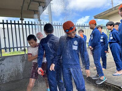 9月12日(火)の5・6年生の水泳の授業では、水難事故に遭った際に自分の命を守るために着衣泳を実施しました。今日もお隣に居てくれる大切なバディーの存在を確認し、まずはシャワーコーナーへ。冷てぇ~!と言いつつ、ん?何か体が重いぞ!という反応。早速体への負荷を実感、去年も実施しているので思い出したご様子!
