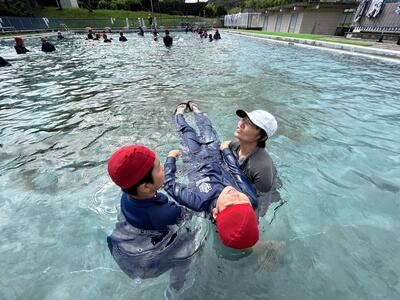 コツをつかむとこの通り!さらにバディーとともに仲良く手を取り合ってプカプカと。確か服を着て溺れていることを想定しての練習なのに、バカンスを楽しむ二人に見えてしまい、みんなで大笑いとなりました。