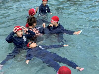 先生「それじゃ、水に浮く練習をしてみよう!」ということで、服の中に空気を入れ込んで仰向けになって浮く練習へ。合わせてサンダルも使ってプカプカと。