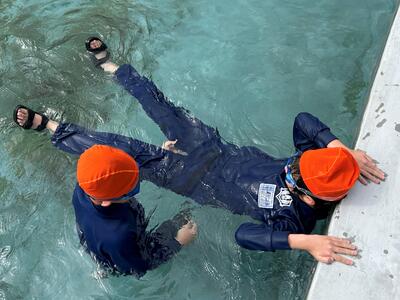 そして「さあ泳いでみよう!」ということでプールサイドへGO!するとすぐに、これはだめだ!手が上がらない!足が動かない!疲れる!エネルギーの無駄づかい!浮いていた方が長生きできる!との声が聞こえてきました。溺れないことが最も大事!でも、実際溺れてしまったらどうすればいいのか?と、それぞれに感想を述べ合いました。