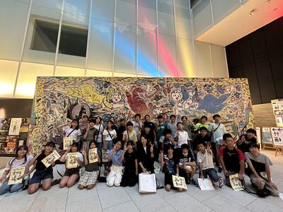 ホール内は撮影を遠慮しましたが、ホンモノを観た子どもたち、「面白かったし、感動した!」「ダンスや歌が凄かった!」、中には「エルコスはみんなの心の中にもいると思う!」という感想も。「学習発表会であんなふうにやりたい!」の声も聞かれました!「舞台は、本気で創る側と、それを本気で観る側とが一つになってこそ成り立つのよ!」とは私が恩師からいただいた言葉。本校の子どもたちは言われなくてもその意味を理解していたようで嬉しかったです!帰りがけ、棟方志功作「大平和の頌」の陶板の前で記念写真!