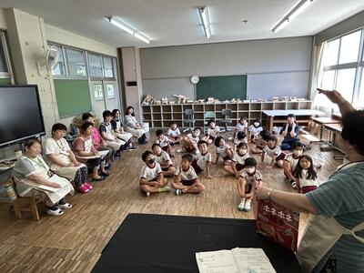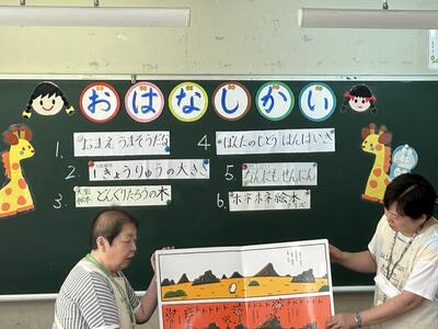 9月12日(火)、いつもは本校自慢の学校図書館内にある畳の部屋で行われる「おはなし会」ですが、残暑が厳しいので、今回は涼しいお部屋で開催しました。本日のラインナップはこちら。早速、大型絵本「おまえうまそうだな」の始まり始まり!でざいます。