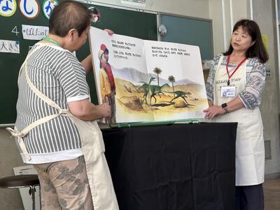 次に「きょうりゅうの大きさ」。自分の背丈をベースに大小さまざまな恐竜とのサイズを比較。「3年生くらいになるとだんだん長さとか広さに興味をもつようになるからね」とはボランティアさんのお言葉。その通りでございました。これまでの3年生なら、でけー!とかおっかねー!とか言って大きなリアクションをしていたのですが、今日の3年生はじーっと絵本を見て、頭の中で大きさ比較をしている様子がうかがえました。