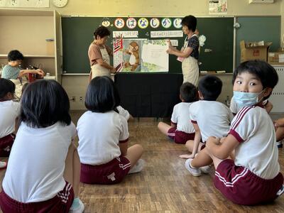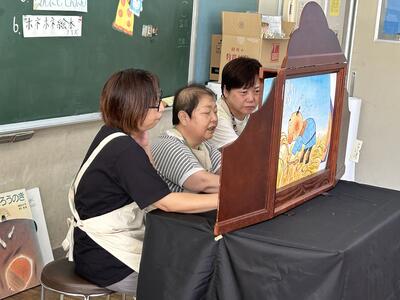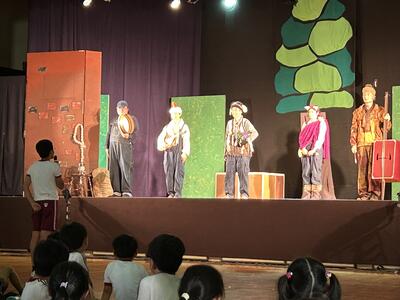 紙芝居「なんにもせんにん」は、ボランティアさん3人による協働でございます。「みんな、怠け者になってはダメよ!」というボランティアさんのメッセージですね。