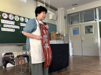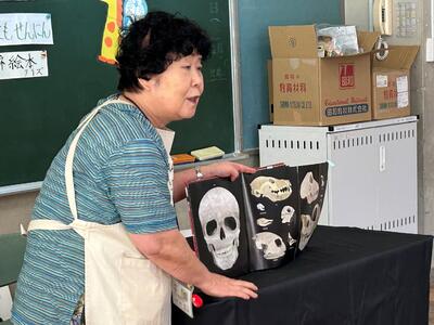 本日ラストは「ホネホネ絵本」でございます。このテーマ3年生の好奇心をくすぐりますね。途中「頭の骨だけ隙間がなくて真っ白だ!」という子どもたちのつぶやき。それに対して「なんでだと思う?」というボランティアさんの返しがお見事。子どもたちは思考を働かせて「やっぱり脳みそが一番大事だから!」と答えていました。ここでボランティアさんが答えを言ってしまったら子どもたちの脳みそは動かなかったことでしょう。流石でございます!