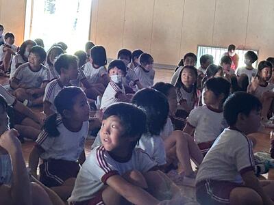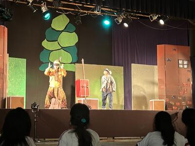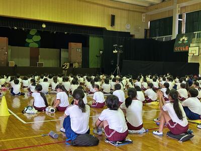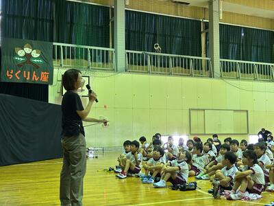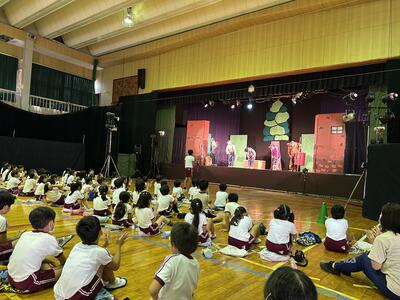 今年の鑑賞教室は9月19日(火)、劇団らくりん座をお招きして開催しました。らくりん座の皆様には昨年もお越しいただきましたので、2年生以上の子どもたちは「今年は何かな?」と。1年生も劇場と化した体育館のステージ下特等席でわくわくそわそわと。