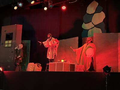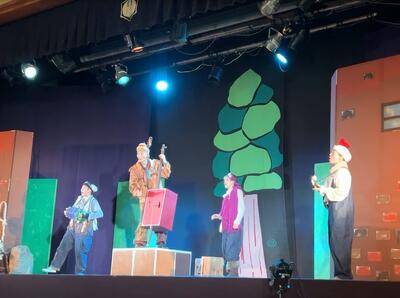 途中で、同じようにご高齢ということで、人間から酷い扱いを受けていたイヌ、ネコ、ニワトリと出会っていきます。それぞれ音楽的センスに秀でていることが分かり、4匹でバンドを組むことに。子どもたちは、「向こうの方に!」のセリフに踊らされて後ろの方を向いてみたり、照明の効果に驚いたりしながら、物語の世界にぐんぐん引き込まれていきました!