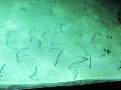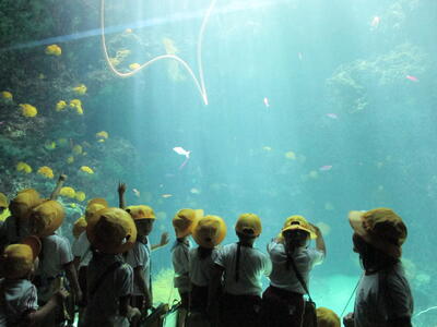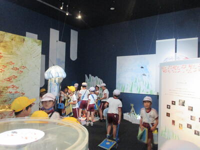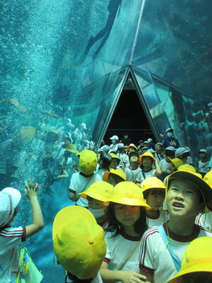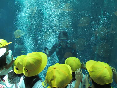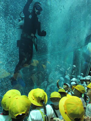 水槽で最も人気があったのは人間!だったとのこと。水槽をお掃除するダイバーさんです。カワウソは人気者ですね。また、イワシの群れに学習したスイミーの姿を重ねていたり、チンアナゴにちょっかいを出してみたりと、館内の隅々まで楽しく見学活動をしていました。