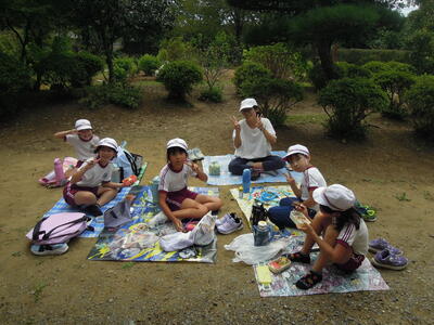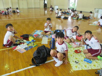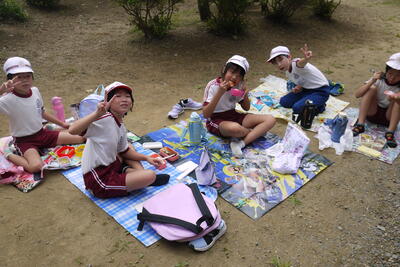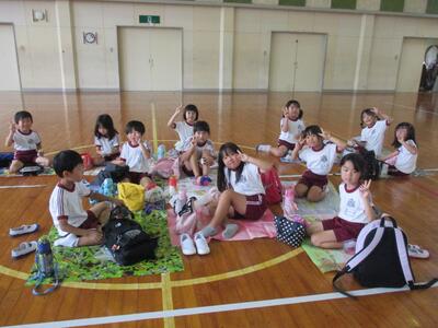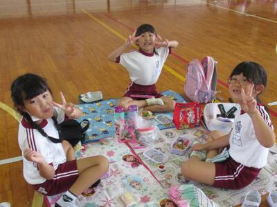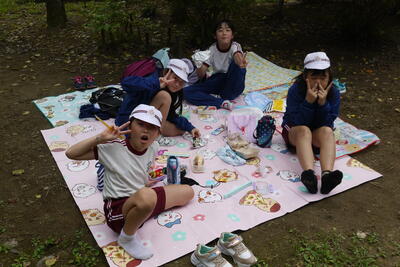 移動するときは手をつないで、みんな仲良しなんです。それでは吹松公園へ...と、ここで雨が降り出してしまい、急遽学校に戻る判断をいたしました。とは言え充実した表情で帰ってた1・2年生、お弁当は体育館にて。いつもと違うシチュエーションで予想以上の笑顔を見せてくれました!