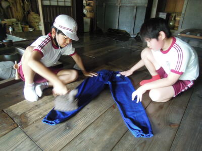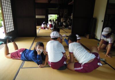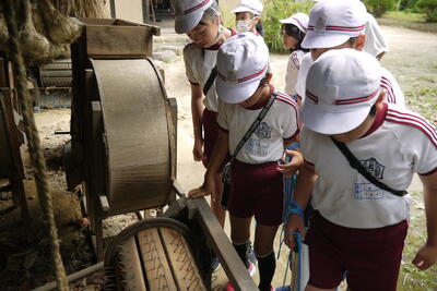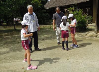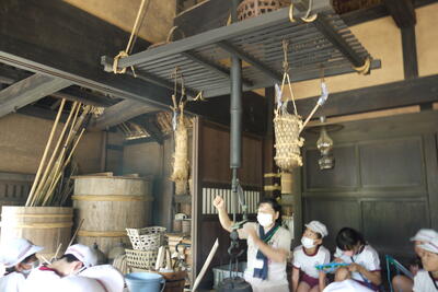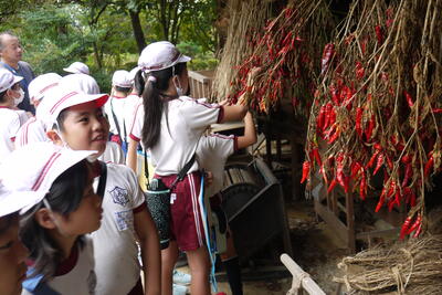 4年生は社会科で「昔の道具調べ」を学習済み&昨年も訪問したので後輩たちを導きながら積極的に活動を。「あっ!とんがらし!」と声を出して、国語科「ごんぎつね」に出てくる「百姓家のうら手につるしてあるとんがらし」を思い出したご様子。3年生は社会科の予習として貴重な体験の機会となりました。