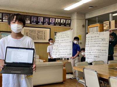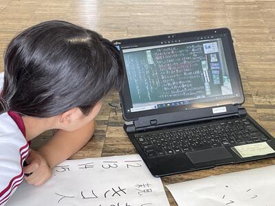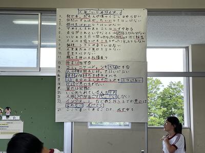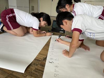 さらにこの話には続きがありまして、6年生にほど近い5年生も、いじめや人権について話合いをしたとのこと。「やっぱりいじめはだめだよね!」という思いに至って、それをどう行動に移していくかが話題になり、それなら6年生に学ぼうということで話を聞いて、結果、6年生に倣って「5年いじめ防止法」を制定したとのこと。5年生は23箇条です!とのことで、代表委員が休み時間を使って模造紙に条文を書いていました。
