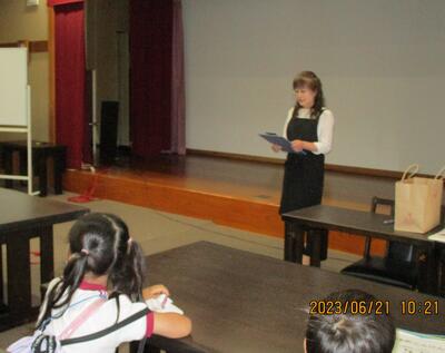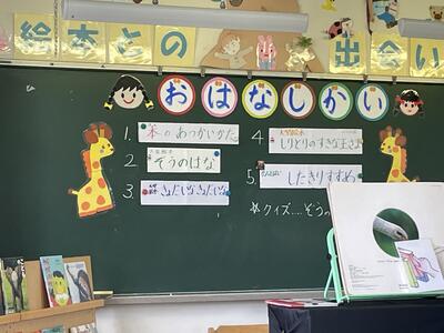 6月13日(火)、図書館ボランティアの先生方による今年度初めての読み聞かせ「おはなし会」を開催しました。今回は7名の先生が1年生を対象に行いました。1年生は、小学生になって初めてのおはなし会に、わくわく感満載で畳の部屋に入ってきました。本日のメニューはこちら。