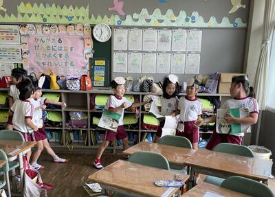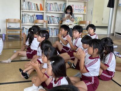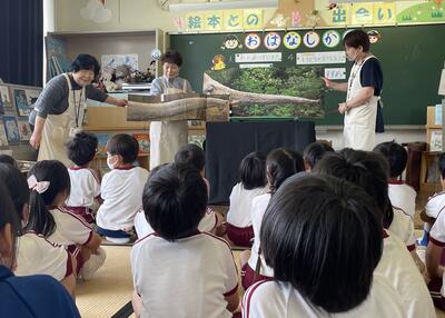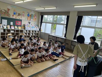 まずは、「本のあつかい方」について、「本は背表紙が一番弱いところなの。本棚から取り出すときは指で引っかけないでね。」等々、実演も交えて具体的にお話しくださいました。「みんなの本だから大切に持ち運びしましょうね!」等々のとの呼びかけにみんなしっかりと「はい!」と返事をして応えていました。