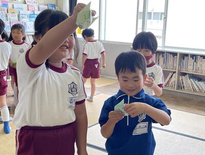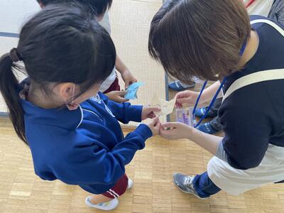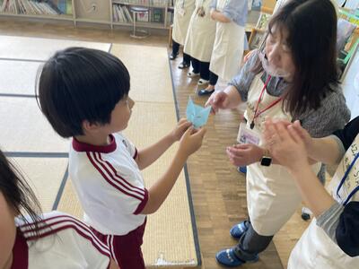 最後に、先生方から素敵なプレゼントが。しりとり遊びの続きということで、「こぶたたぬききつねねこ」が組み合わさった折り紙作品が一人ひとりに手渡されました。手作り感が何とも素敵!各動物の似顔絵がとてもかわいらしく、授業時間が終わっても先生方との交流は続いておりました。