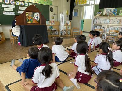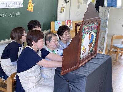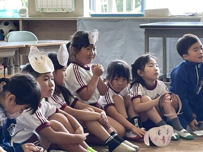 4作目は、紙芝居で「したきりすずめ」を。子どもたち紙芝居装置にも興味津々。先生方総掛かりで、子どもたちをおとぎ話の世界に引き込んでいきました。ストのおばあさんの結末を知って、子どもたちなりに、やっぱりわがままだとか欲張りだとかそれはよくないな!って感じた様子でした。