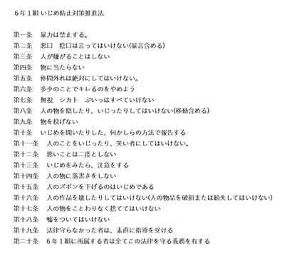 するとその日の放課後、校長室に6年生がお越しになり、「わたしたちで『6年1組いじめ防止対策推進法20箇条』をつくったので聞いてください!」とお話しになりました。