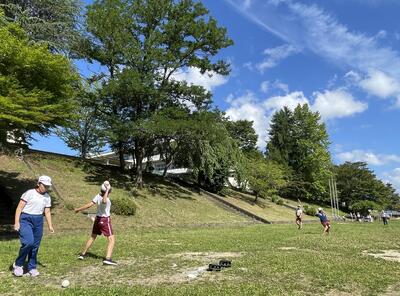 ソフトボール投げチームは、土手に向けて投げるというオリジナル練習法も駆使して、投球フォームの最終調整に励んでいました。
