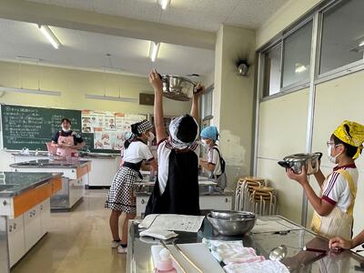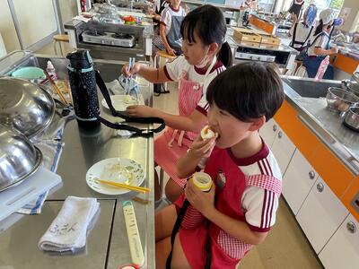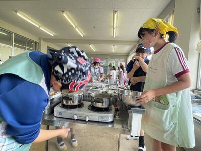 6月13日(火)、5年生は家庭科の授業で初めての調理実習にチャレンジしました。身支度を整え、調理器具の確認から...。でも子どもたち、目の前の食材にわくわく感があふれ出てきてしまったようで、先生も「まずは落ち着いて、一つひとつ確認するよ!」と声を張り上げて呼び掛けておりました。