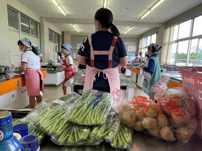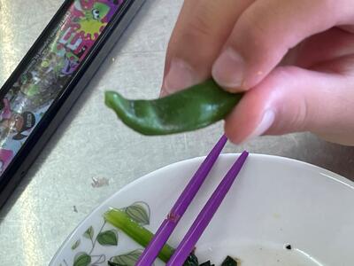 こうして2時間はあっという間に過ぎていきました。頑張ったね!と声を掛けて回っていると、な、なんとお皿の上にサヤインゲンが...。今朝、畑から消えていておかしいな~と思っていたのですが、まさかここで目にするとは。さすがはじける5年生でございます!