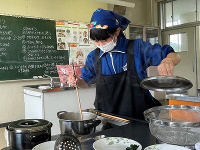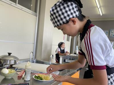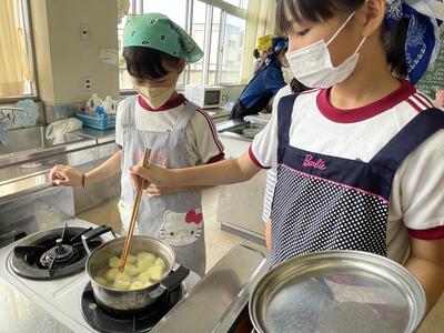 大きなテーマは「ゆでる!」。調理器具の扱い方とともに、見慣れたほうれん草とじゃがいもと卵のお料理ですが、ゆで方の違い、調理方法の違いを学習していきました。時間の都合で、初心者が多いと聞いていた華麗な?包丁さばきを見届けることはできませんでしたが、ほうれん草のお浸しの長さがきれいにそろっていたところから、あれこれチェックしながら慎重に丁寧に活動していたことが伺えました。こちらはじゃがいもと卵をゆでているところ。「火の加減はこんくらい?」とか言いながら...。