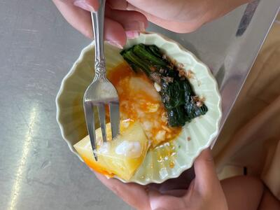 あるグループは、半熟の半熟卵を完成させたようで、「ほうれん草とじゃがいもの半熟卵和え」という新メニューを開発してくれました。これが不思議と美味しくて、可笑しくて!