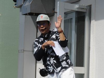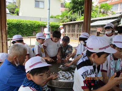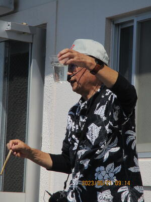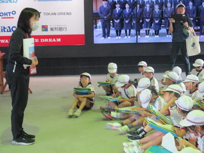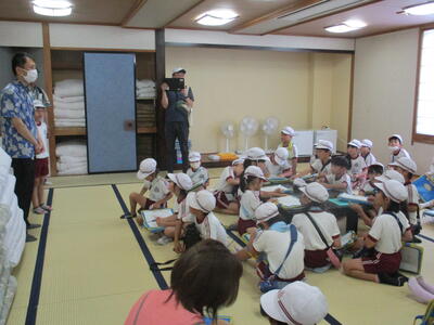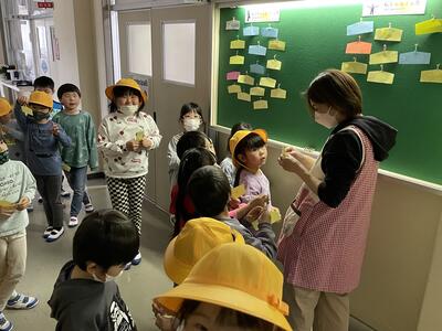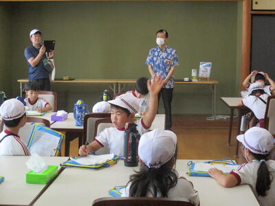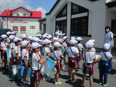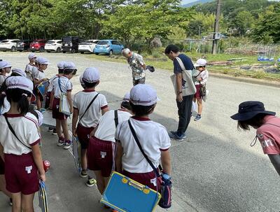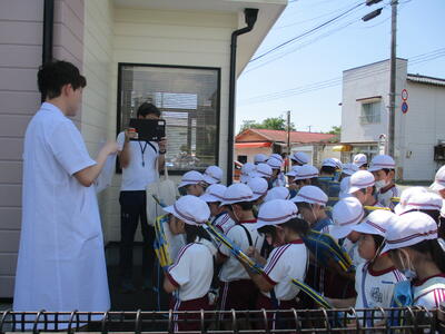 あれあれ青い服の方。どこかで見たこの背中。今年度から学校評議員をお願いしている今野先生ではありませんか。「去年、この子たちの町探検に付き添ったから、ついつい来ちゃった!」とのこと。「いやー、あいさつも素晴らしくて、大きくなったない!」と、目を細めてお話しくださいました。いつも子どもたちを見守ってくださり感謝でございます。