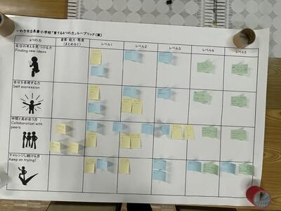 次に話題となったのは「育てる4つの力」とは具体的にどんな姿?ということでした。私たちは、点数で表すことが難しいこれらの力について、具体的な子どもたちの姿をイメージして文章で表現し、見える化して、到達度毎に表にまとめることにチャレンジしていきました。