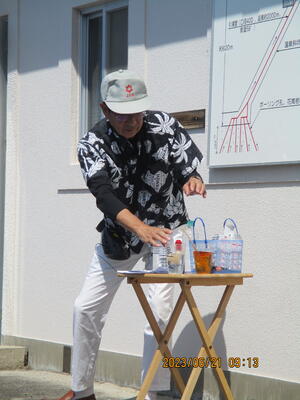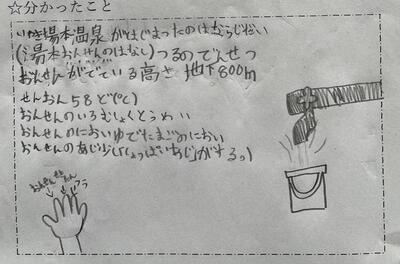 特に、湯本温泉の泉質のすごいところ!について、赤色の液体が透明になる!という実験を通して解説してくださいました。子どもたちなりに「お肌がきれいになる!」「からだの錆がおちる!」と解釈。科学的思考の世界にお導きくださいました。