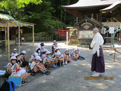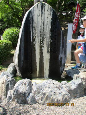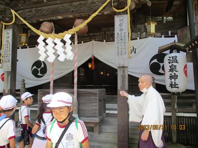 次に向かったのは、千年以上も昔からこの地を見守り続けてきた温泉神社。神主さんのお話は、まさに湯本の歴史そのもの。入口には温泉が流れ出る「温泉碑」があって、白いのは湯の花。子どもたち「すげー!」って、去年も見ていますからね...。