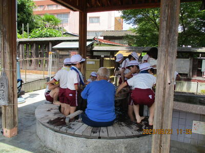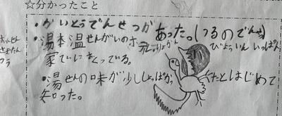 ラストは鶴の足湯。子どもたちは「温泉はどこからやってきて、どこに流れていくのか?」というテーマを探究し、暑い中でのフィールドワークを無事終えてホットしたのでしょう。温泉効果も相俟ってこの表情でございます。もう一つのテーマ「なぜ鶴が?」ということについてもずいぶん話題になっていましたね。