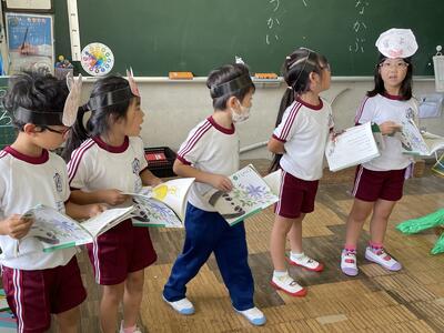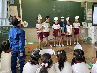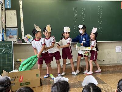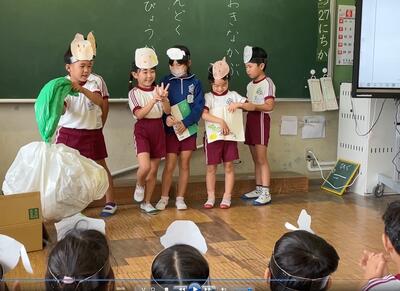 現在、国語の授業で「おおきなかぶ」を学習しているとのこと。図工の授業とリンクさせて、登場する人や動物のお面をつくって、今日は4つのグループに分かれて音読劇にチャレンジするのだそう。早速、各グループ5分間の最終リハーサルへ。担当する役は決まっているようで、「登場するタイミングはどこ?」「『うんとこしょ、どっこいしょ!』の動きはどうする?」といった打合せを頑張っていました。