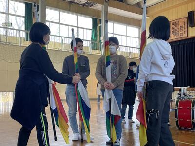 6年生主指揮のあいさつ「5年生の皆さん、鼓笛の本番の運動会までは思ったより時間が短いので練習を頑張ってください!令和4年度6年生より」そしてメジャーバトンの引継ぎ。会場中の視線が一点に集まり厳粛な雰囲気で。ここに「ながくらの鼓笛」引継ぎ完了となりました。