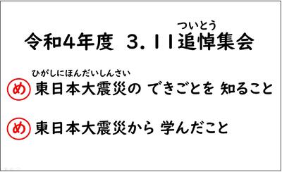 はじめに震災の概要を説明した上で、「この週末は、改めてこの出来事に関することがニュースや新聞等で話題になると思いますので、さらに理解を深めて、どんな出来事だったのか、自分なりの言葉で話ができる人になって欲しい」と呼びかけさせていただきました。ご家庭でも話題としていただければ幸いです。