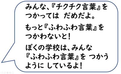 この男の子の言葉によって避難所は冷静さを取り戻し、助け合い、譲り合うようになっていったというお話。やはり言葉は大事!ということを改めて学んだのですが、子どもたちには「大震災というピンチの場面で大いに役立った『ふわふわ言葉』を、私たちの普段の生活でも使ってみてはどうでしょう?」と提案させていただきました。そしてそのために「ぜひ人のよいところや頑張っていることを見つけて、それを伝えることができる人になって欲しい」とお話しさせていただきました。