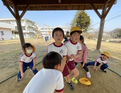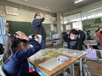 デニス先生「hands on your head(手を頭に乗せて)」、そして絶妙な間を取ってからの「Cow(牛)!」、子どもたちは「あった!」「取られた!」の声があちこちで。夢中になって活動していました。
