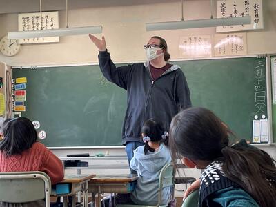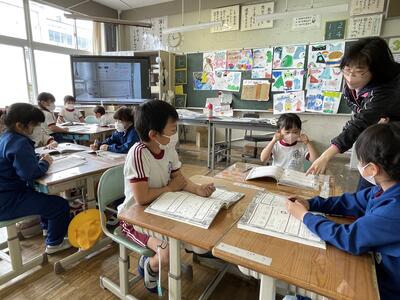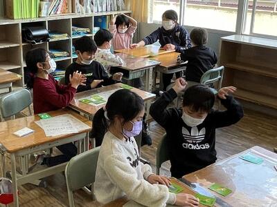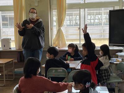 本校の外国語指導助手(ALT)のデニス先生、3月14日(火)が今年度最後の来校日でした。今日も熱心にご指導いただきました。こちらは2年生の授業に参加し、動物の英語カルタ遊びをしているところ。デニス先生が英語で動物名を伝え、子どもたちは数ある英語表記の動物カードを競争で取るという活動。