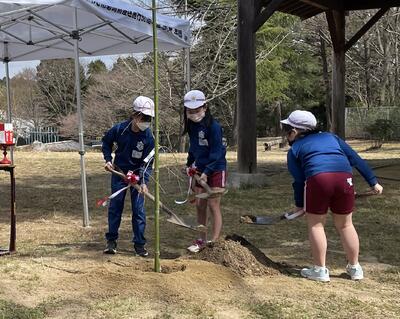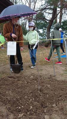 子どもたちは「おー、すげー!」「桜だ!」「これが立命館小学校だ!」「醍醐寺、醍醐寺...」「豊臣秀吉」等々の率直な感想。「桜の花はいつ咲くのかな?」とわくわくしながら、喜んで作業を行っていました。造園会社の方から「桜を植えたら水をいっぱいやるのが大事!」とのこと。子どもたちのニコニコ顔を応援するかのように、ちょうど雨が降り出して参りました。スコップで作業するお友達を気遣って傘を差してあげる姿も、優しいですね!