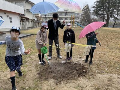 それでも子どもたちは、ちゃんと水をやらなくちゃ!と如雨露に水を汲んできたっぷりと水やりをしていました!大切な桜の木、無事に育ってね!とか言いながら...。こちらは教頭先生が子どもたちをサポート。