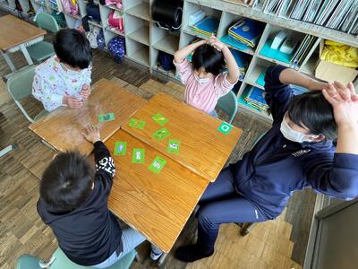 授業の最後にデニス先生「カード、何枚取りましたか?(日本語)」の質問に、「eight!(8)」と自然と英語で答える子どもたち、デニス先生のおかげですっかり外国人になりきって英語を話しておりました。
