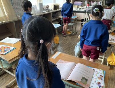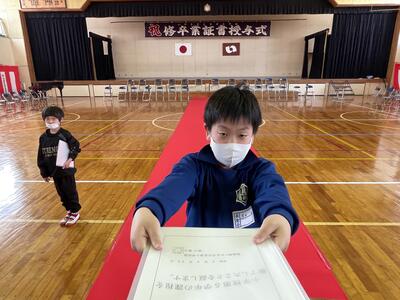 さて修了証書を受け取る練習。特に緊張していたのは1年生代表児童。事前に先生方から移動や受け取り方のレクチャーを何度も何度も受けていたのですが、いざ本番ではすべてが真っ白になってしまい...。すぐに追レクチャーを受けたのですがいまいちだったご様子。ではでは!ということで5年生代表児童にお願いして模範を見せていただくことに。その様子をじっと見つめる1年生児童。