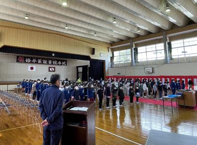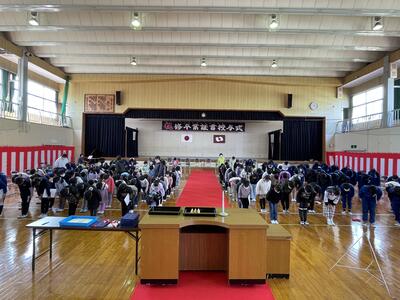 3月16日(木)、1~5年生が体育館に入場し、修了式の全体練習を行いました。会場に紅白幕と卒業式の看板が設置されていることもあってか、子どもたちは背筋をピンと伸ばして、清々しい雰囲気の中での練習となりました。新型コロナウイルス感染症対策の影響で、一堂に会しての開催は2年ぶりとなる予定です。やはりオンラインではなく、全員で実施することに意味があることを実感しました。
