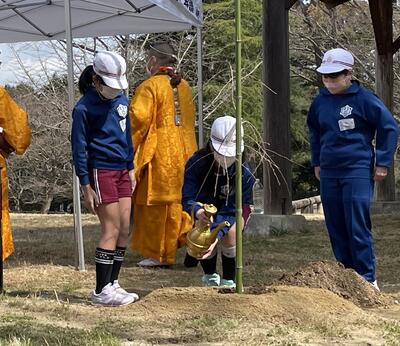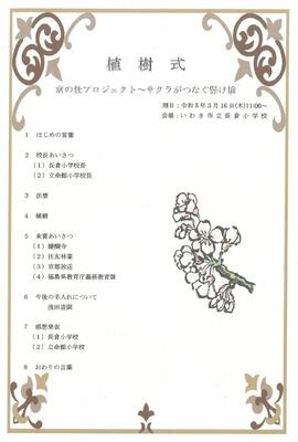 本校を代表して4年生が担当して進めてきた「京の杜プロジェクト」、醍醐寺の「太閤千代しだれ桜」の植樹式を3月16日(木)に実施しました。苗木を育ててくださった立命館小学校の皆様にはOn-lineで結び見守っていただき、本プロジェクトを主催している醍醐寺様、住友林業様、KSB京都様には遠路はるばるお越しいただきました。そして義務教育課の主任指導主事様、本校PTA執行部・4年生保護者の皆様にもご出席いただきました。ありがとうございました。