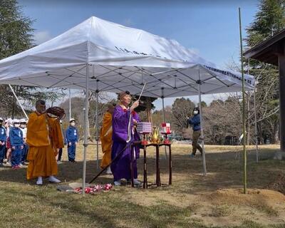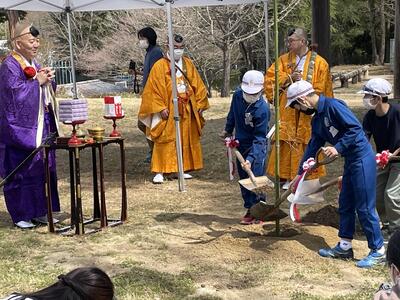 植樹式は苗木を植えた土俵横で。はじめに醍醐寺様の法螺貝が勇壮に長倉の杜に響き渡り、お祈りしていただきました。
