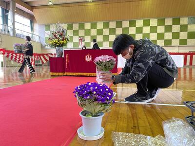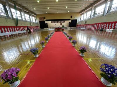 さて、放課後の体育館。会場の華やかさを演出するサイネリアも無事到着。花言葉は「いつも快活」「喜び」だそう。本校の子どもたちにぴったりの言葉ですね。先生方が式場の最後の確認を行ってくださいました。準備完了でございます!