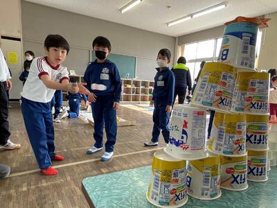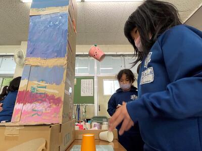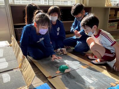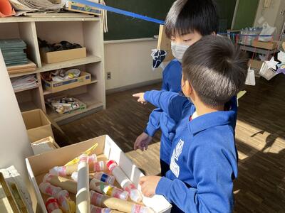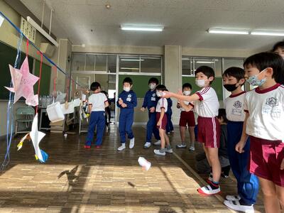 こちらは空気鉄砲「ロケットポン!」。安全面に配慮して、飛ばすのは乳製品乳酸菌飲料のプラスチック容器。的に当てて欲しい!と的の高さを1年生目線でセットしたとのこと。「もっと前からでもいいよ!」とどんどん前へ誘導する2年生、的に当たった時のみんなの「ヨッシャー!」は気持ちよかったですね!