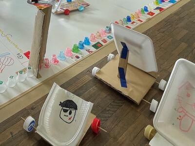 一方、こちらは「やっとかー(又はGTグランプリ)」。帆が付いた四輪車をうちわで扇ぎ、ゴールまで走らせるというアクティビティ。風の向きを考えないと思わぬ方向へ...。様々な国旗やキャップを使ったコースデザイン、そしてスポーツカーの装飾で意欲をかき立てる工夫が素敵。盛り上がっていましたね!